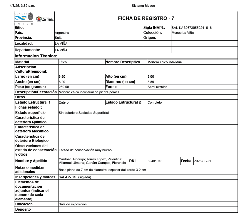 Retomando los términos de este convenio, las acciones efectuadas en el museo consistieron en acondicionar de los objetos arqueológicos, registrarlos con su información descriptiva, registro fotográfico, elaboración de modelos 3D y diseño de un sistema de gestión digital de la Colección arqueológica del museo. Esto permitirá al municipio y al Museo de Antropología de Salta contar con las fichas solicitadas por el El Registro Nacional de Yacimientos, Colecciones y Objetos Arqueológicos (Ley Nacional N° 25.743).